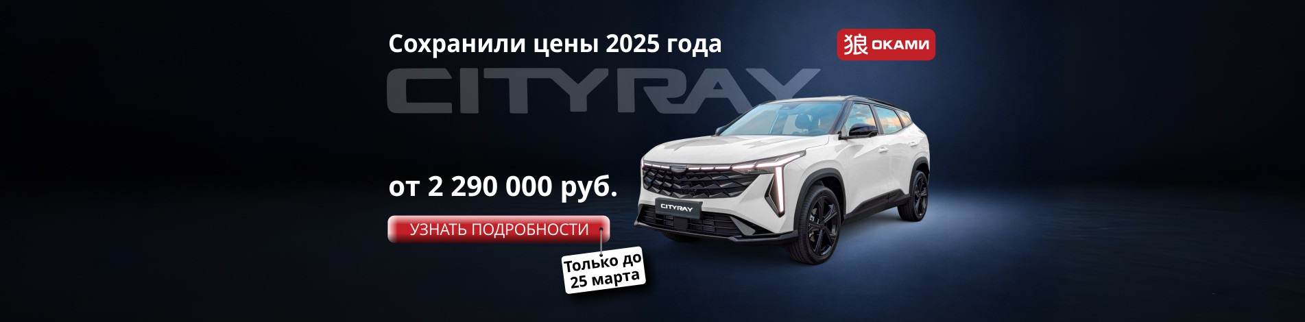 Указана минимальная розничная цена на автомобиль Geely Cityray 2025 года выпуска в комплектации Comfort. Цена действительна для автомобилей 2025 г.в., имеющихся в наличии в дилерском центре Geely ОКАМИ на момент обращения. Количество автомобилей по указанной цене ограничено. Предложение действует до 25.03.2026 включительно. Цена 2 849 990 руб. — рекомендованная розничная цена на автомобиль Geely Cityray 2026 г.в. в комплектации Comfort по состоянию на 18.03.2026. Фактическая экономия зависит от выбранной комплектации и условий приобретения. Внешний вид автомобиля на изображениях может отличаться от фактического. Автомобиль сертифицирован в установленном порядке. Предложение носит информационный характер и не является публичной офертой (ст. 437 ГК РФ). Для получения подробной информации об условиях приобретения, комплектациях и наличии обращайтесь в дилерский центр Geely ОКАМИ: +7 (343) 227-62-77, ул. Металлургов, 82, Екатеринбург. ООО "АВА-Моторс" (ИНН 6674300001, geely.okami.ru).