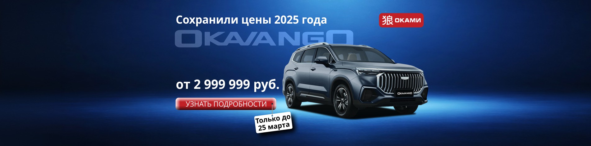 Указана минимальная розничная цена на автомобиль Geely Okavango 2025 года выпуска в комплектации Flagship. Цена действительна для автомобилей 2025 г.в., имеющихся в наличии в дилерском центре Geely ОКАМИ на момент обращения. Количество автомобилей по указанной цене ограничено. Предложение действует до 25.03.2026 включительно. Цена 3 908 990 руб. — рекомендованная розничная цена на автомобиль Geely Okavango 2026 г.в. в комплектации Flagship по состоянию на 18.03.2026. Фактическая экономия зависит от условий приобретения. Внешний вид автомобиля на изображениях может отличаться от фактического. Автомобиль сертифицирован в установленном порядке. Предложение носит информационный характер и не является публичной офертой (ст. 437 ГК РФ). Для получения подробной информации обращайтесь в дилерский центр Geely ОКАМИ: +7 (343) 227-62-77, ул. Металлургов, 82, Екатеринбург. ООО "АВА-Моторс" (ИНН 6674300001, geely.okami.ru).